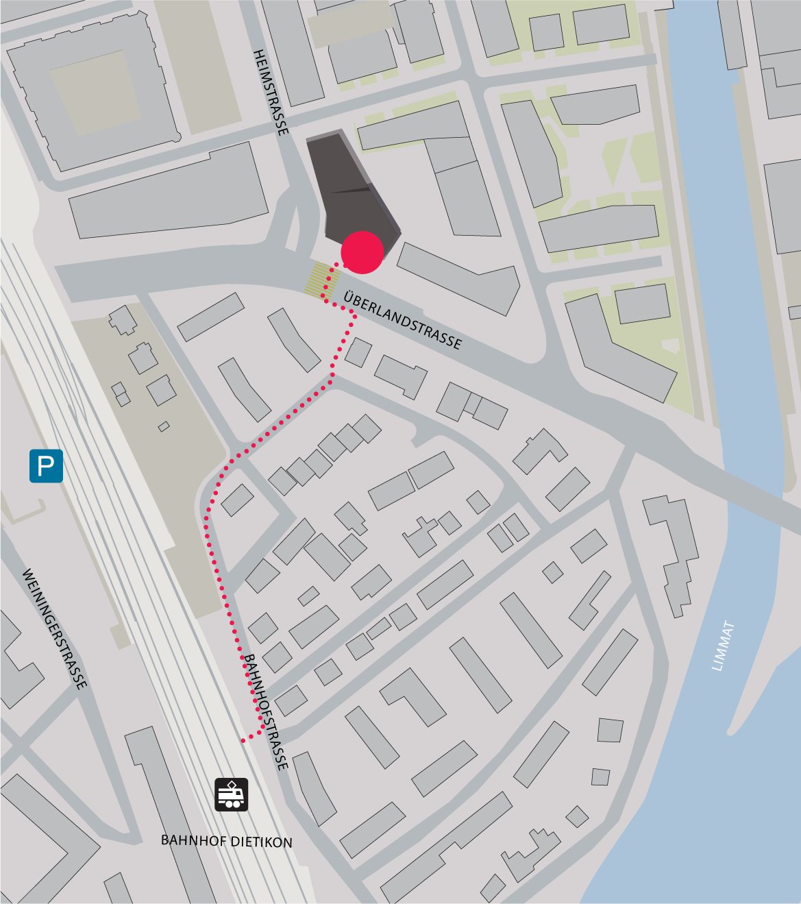 Der Limmat Tower befindet sich nur drei Gehminuten vom Bahnhof Dietikon entfernt, den Sie mit der S-Bahn ab Zürich Hauptbahnhof regelmässig mit einer Fahrzeit von 15 Minuten erreichen. Den Bahnhof Dietikon erreichen Sie mit den S-Bahnlinien S3, S12, S19 und S42. Vom Bahnhof Dietikon aus bedienen die Buslinien 301, 302 und 304 die Bushaltestelle «Heimstrasse» in unmittelbarer Nähe des Limmat Tower.